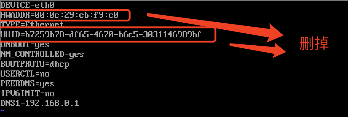 删除里面两句话,如下图:注意:有几块网卡就得删掉几块的对应配置文件的HWADDR,UUID。