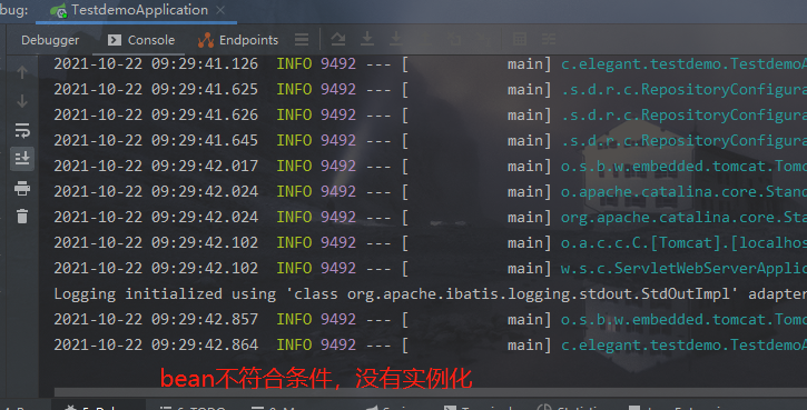再启动项目,可以看到这个bean没有被实例化,因为不符合条件: