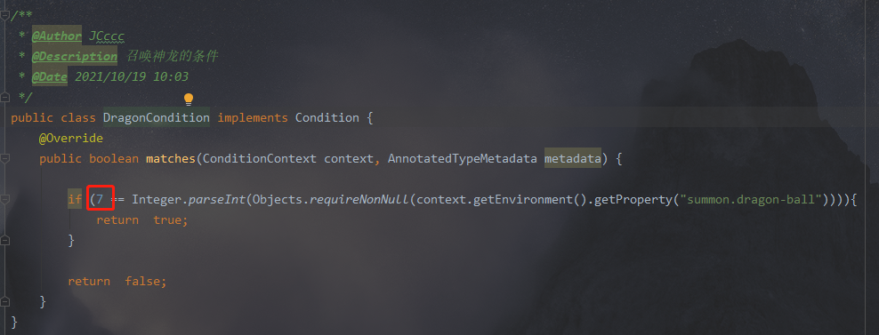 if (7 == Integer.parseInt(Objects.requireNonNull(context.getEnvironment().getProperty("summon.dragon-ball")))){
