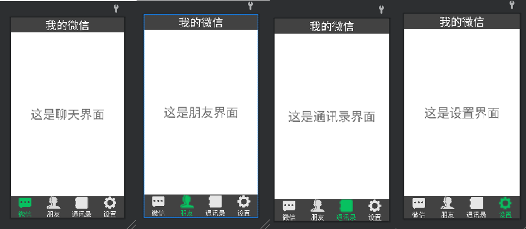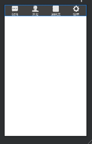 <?xml version="1.0" encoding="utf-8"?> <LinearLayout xmlns:android="http://schemas.android.com/apk/res/android" xmlns:app="http://schemas.android.com/apk/res-auto" xmlns:tools="http://schemas.android.com/tools" android:layout_width="match_parent" android:layout_height="80dp" android:background="@color/cardview_dark_background" android:baselineAligned="false" android:orientation="horizontal"> <LinearLayout android:id="@+id/bottomView1" android:layout_width="0dp" android:layout_height="match_parent" android:layout_weight="1" android:gravity="center" android:orientation="vertical"> <ImageButton android:id="@+id/imageButton1" android:layout_width="50dp" android:layout_height="50dp" android:background="@color/cardview_dark_background" android:clickable="false" android:contentDescription="@string/app_name" android:scaleType="fitXY" app:srcCompat="@drawable/dialogue" /> <TextView android:id="@+id/textView1" android:layout_width="wrap_content" android:layout_height="wrap_content" android:gravity="center_horizontal" android:text="微信" android:textColor="#e6e6e6" android:textSize="24sp" /> </LinearLayout> <LinearLayout android:id="@+id/bottomView2" android:layout_width="0dp" android:layout_height="match_parent" android:layout_weight="1" android:gravity="center" android:orientation="vertical"> <ImageButton android:id="@+id/imageButton2" android:layout_width="50dp" android:layout_height="50dp" android:background="@color/cardview_dark_background" android:clickable="false" android:contentDescription="@string/app_name" android:scaleType="fitXY" app:srcCompat="@drawable/friend" /> <TextView android:id="@+id/textView2" android:layout_width="wrap_content" android:layout_height="wrap_content" android:layout_gravity="center_horizontal" android:text="朋友" android:textColor="#e6e6e6" android:textSize="24sp" /> </LinearLayout> <LinearLayout android:id="@+id/bottomView3" android:layout_width="0dp" android:layout_height="match_parent" android:layout_weight="1" android:gravity="center" android:orientation="vertical"> <ImageButton android:id="@+id/imageButton3" android:layout_width="50dp" android:layout_height="50dp" android:background="@color/cardview_dark_background" android:clickable="false" android:contentDescription="@string/app_name" android:scaleType="fitXY" app:srcCompat="@drawable/mail" /> <TextView android:id="@+id/textView3" android:layout_width="wrap_content" android:layout_height="wrap_content" android:layout_gravity="center_horizontal" android:text="通讯录" android:textColor="#e6e6e6" android:textSize="24sp" /> </LinearLayout> <LinearLayout android:id="@+id/bottomView4" android:layout_width="0dp" android:layout_height="match_parent" android:layout_weight="1" android:gravity="center" android:orientation="vertical"> <ImageButton android:id="@+id/imageButton4" android:layout_width="50dp" android:layout_height="50dp" android:background="@color/cardview_dark_background" android:clickable="false" android:contentDescription="@string/app_name" android:scaleType="fitXY" android:src="@drawable/setup" /> <TextView android:id="@+id/textView4" android:layout_width="wrap_content" android:layout_height="wrap_content" android:gravity="center_horizontal" android:text="设置" android:textColor="#e6e6e6" android:textSize="24sp" /> </LinearLayout> </LinearLayout>