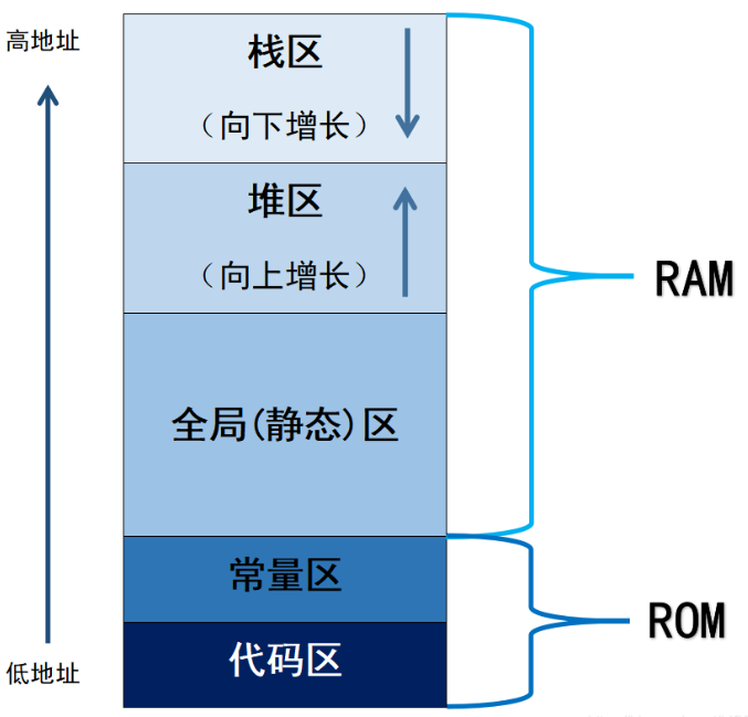 内存区化为四个部分,分别保存 代码段、全局(静态)变量区、栈、堆