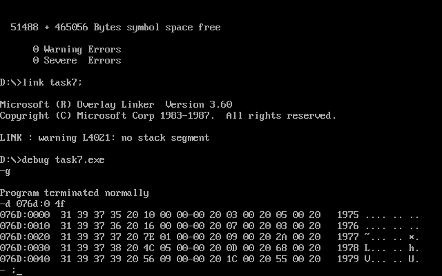 这次的实验主要内容是多个逻辑段的汇编程序的编写,通过这次的实验,我可以更加熟练的运用逻辑段,通过逻辑段,我们可以在内存中存储大量的数据,实现栈结构,或者在内存中查看本程序的源代码。同时,这次实验也极大地锻炼了我的汇编程序编写的综合能力,特别是task7,是一个综合性较强的任务,通过完成这个任务,我熟悉了内存段的存储结构,对不同的数据类型有了更深的理解,也学会了一些新的指令的使用,比如div指令等。