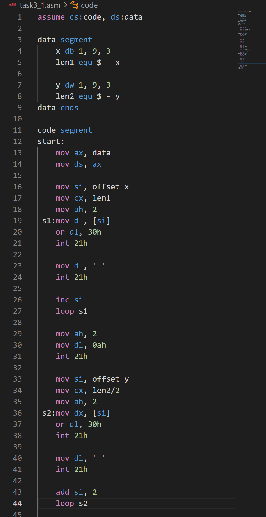 1 assume cs:code, ds:data 2 3 data segment 4 str db 'try' 5 len equ $ - str 6 data ends 7 8 code segment 9 start: 10 mov ax, data 11 mov ds, ax 12 mov si, 0 13 mov cx, 3 14 mov bl, 02h 15 mov bh, 10 16 call printStr 17 mov ah, 4ch 18 int 21h 19 printStr: 20 mov ax, 0b800h 21 mov es, ax 22 mov ax, 0a0h 23 mul bh 24 mov bp, ax 25 mov dx, 0 26 s: 27 mov al, ds:[si] 28 mov ah, bl 29 mov es:[bp], ax 30 inc si 31 add bp, 2 32 loop s 33 ret 34 code ends 35 end start