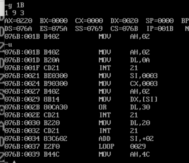 可见loop要跳转到的地址为13,s1偏移量的计算方法是s1上一条指令的偏移地址加上上一条指令的长度,上一条指令的便宜地址为11,而上一条指令B402的长度为2字节,所以计算出s1的偏移量为:11+2=13