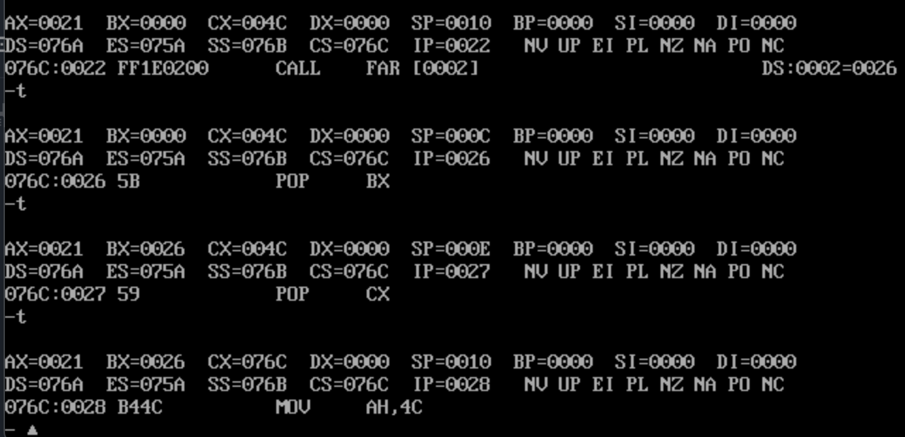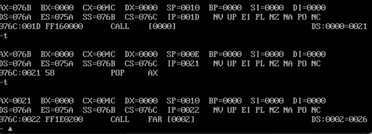 执行到第二次call,并运行两次pop之后,可见第二次call之后确实执行了s2之后的代码,并且bx的值确实是s2标记地址的偏移量,cx确实是当前代码段地址也就是cs寄存器中的内容