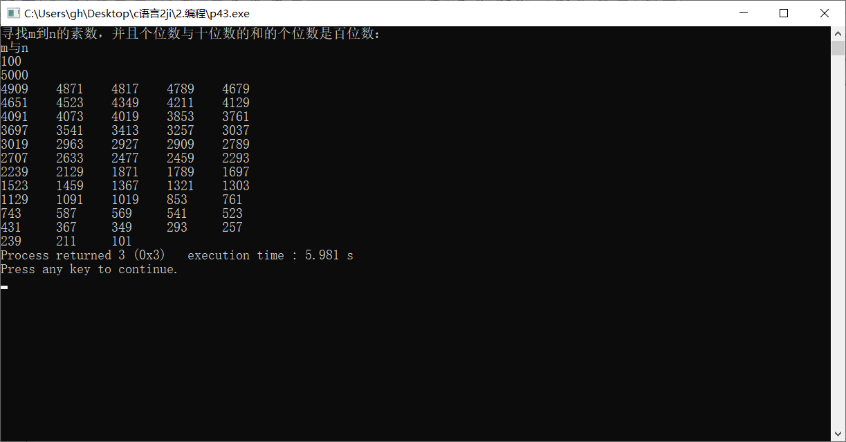 39 printf("寻找m到n的素数,并且个位数与十位数的和的个位数是百位数:\n");