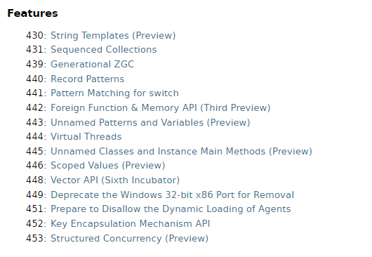 那具体是什么呢?让我们来具体来看一下。下面是JDK21的 Feature。
