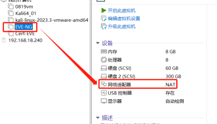 导入完成后,修改Eve-ng的网络适配器为“NAT”模式,方便为实验环境建立一个独立的网络。