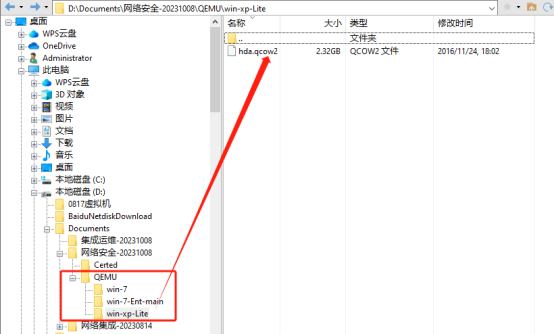 在找到的Windows操作系统环境的组件文件中,QEMU组件文件通常以QCOW2为文件后缀,并且包含在文件夹内。例如:win-xp-Lite文件夹中包含的hda.qcow2就是Windows XP的EVE组件文件。