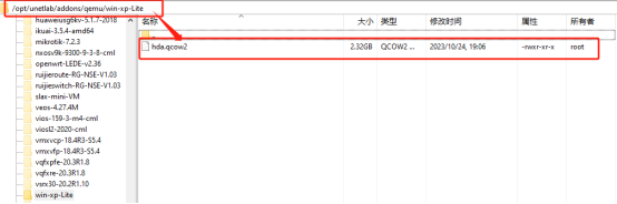 将win-xp-Lite文件夹整体导入到/opt/unetlab/addons/qemu路径,并且为文件夹和文件配置上可执行的X权限。