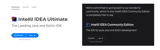 点击进入下载页面,IntelliJ IDEA有两个版本:Ultimate(旗舰版)和Community(社区版)。社区版是一个开源项目,是免费的,它提供了 JVM 和 Android 开发的所有基本功能。旗舰版是商业版收费(限 30 天免费试用),提供了一组出色的工具和特性。根据自己的操作系统对应下载,这里我们选择Windows系统的社区版本,点击Download等待下载完成。