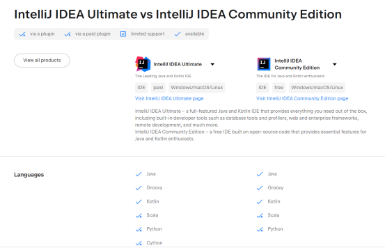有关两个版本的详细信息,请参见官网版本比较矩阵(https://www.jetbrains.com/products/compare/?product=idea&product=idea-ce)。