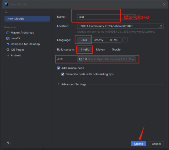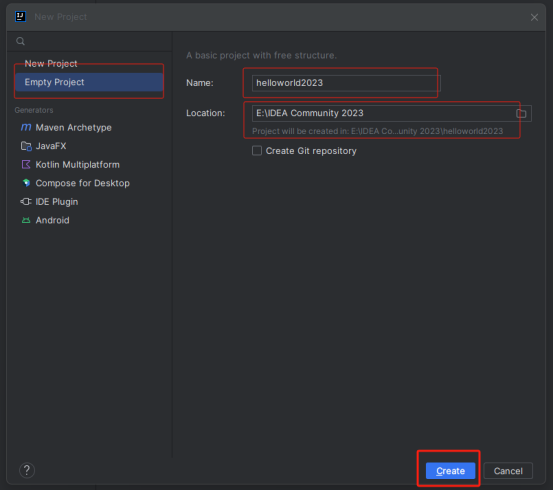 - 选择New Project这里选择创建一个空的项目名为helloworld2023,选择项目创建路径,最后点击创建即可。