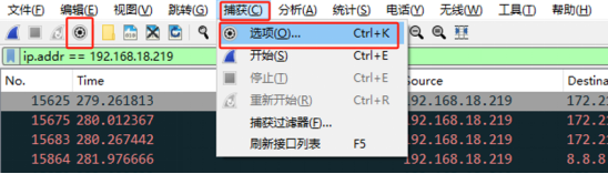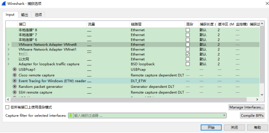 通过Wireshark菜单栏的“捕获”-“选项”和工具栏的“捕获选项”按钮,可以进入接口捕获接口的设置。