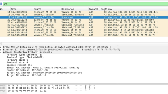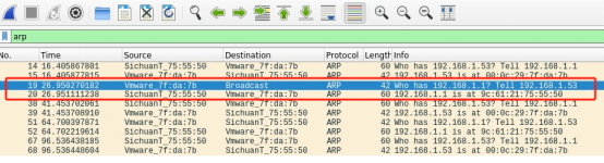 在Wireshark界面,我们可以看到19、20号数据包,就是一对标准的ARP请求和响应包。