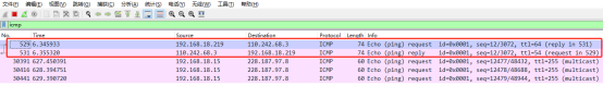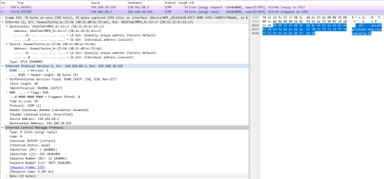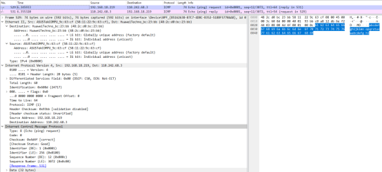 在Wireshark界面,我们可以看到529、531号数据包,就是一对标准的ICMP请求和响应包。