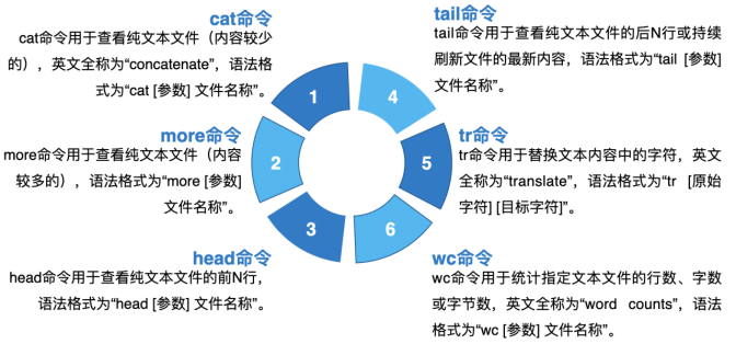(3) ls命令:ls命令用于显示目录中的文件信息,英文全称为“list”,语法格式为“ls [参数] [文件名称]”。