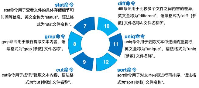 (6) wget命令:wget命令用于在终端命令行中下载网络文件,英文全称为“web get”,语法格式为“wget [参数] 网址”。