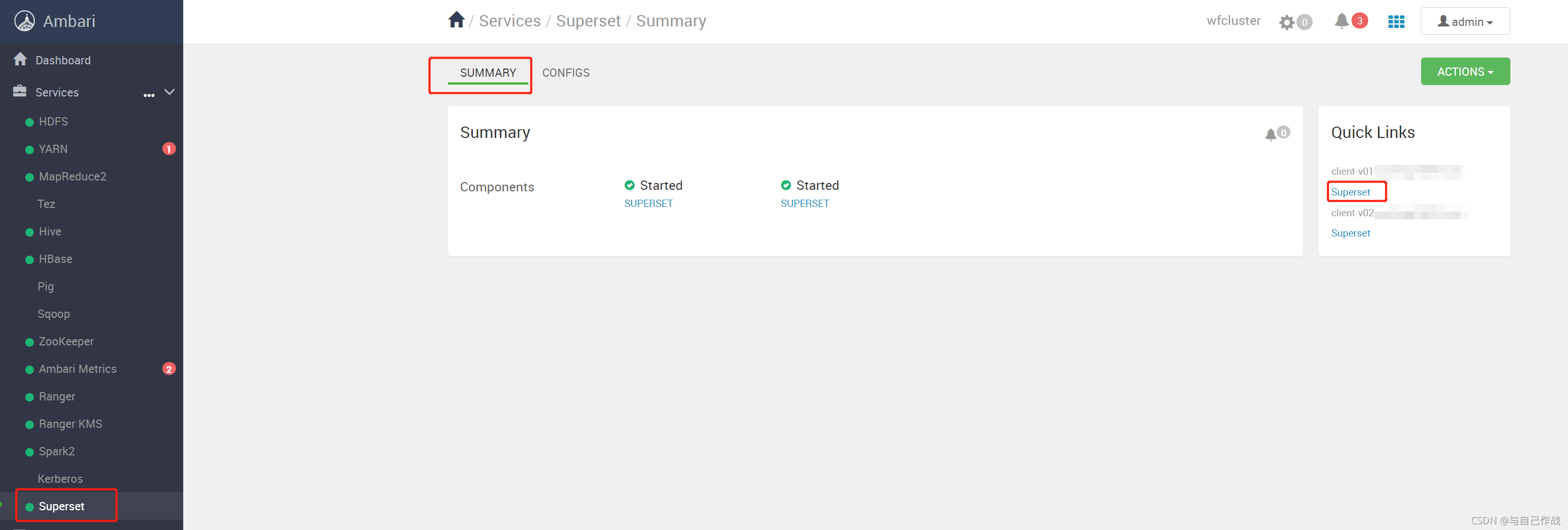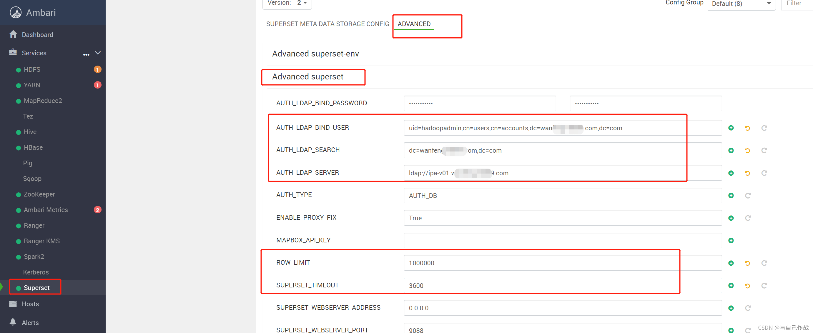 1、在 Ambari 控制台,点击 "Superset"->"CONFIGS"->"ADVANCED" ,在 "Advanced superset"选项中配置类似如下图参数,然后点击保存退出,并重启Superset服务。