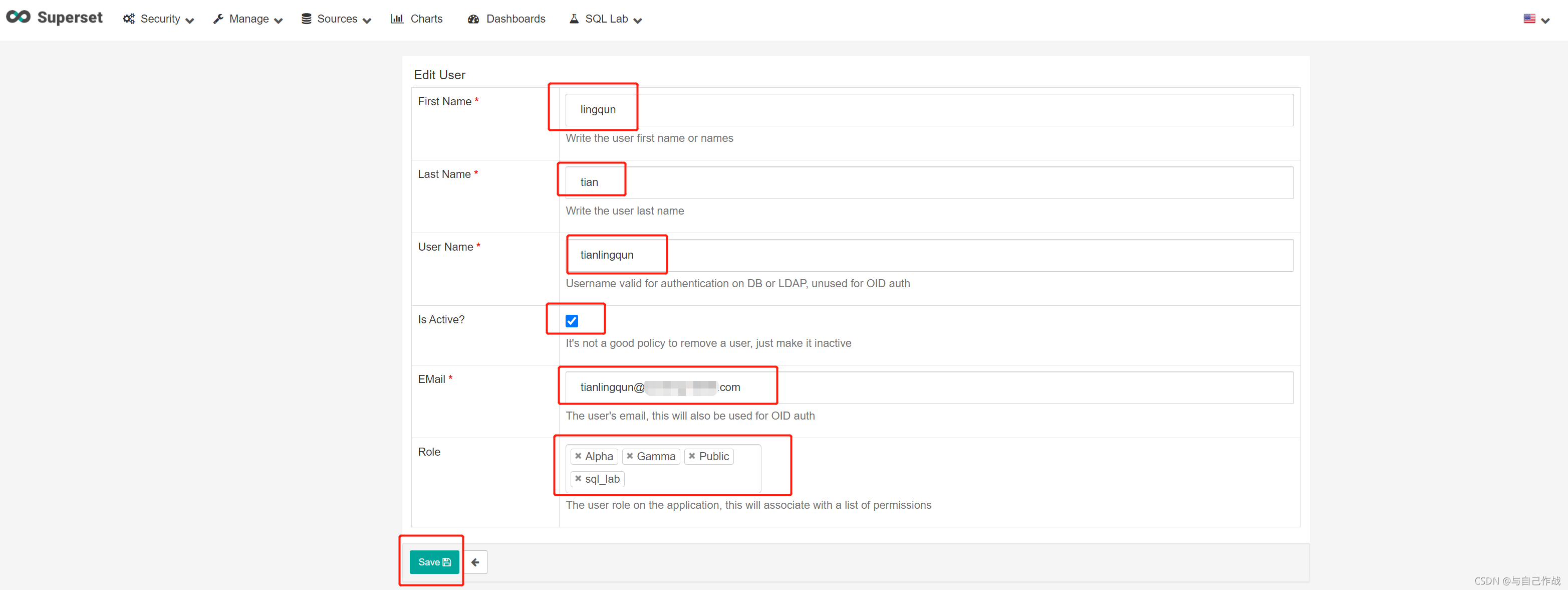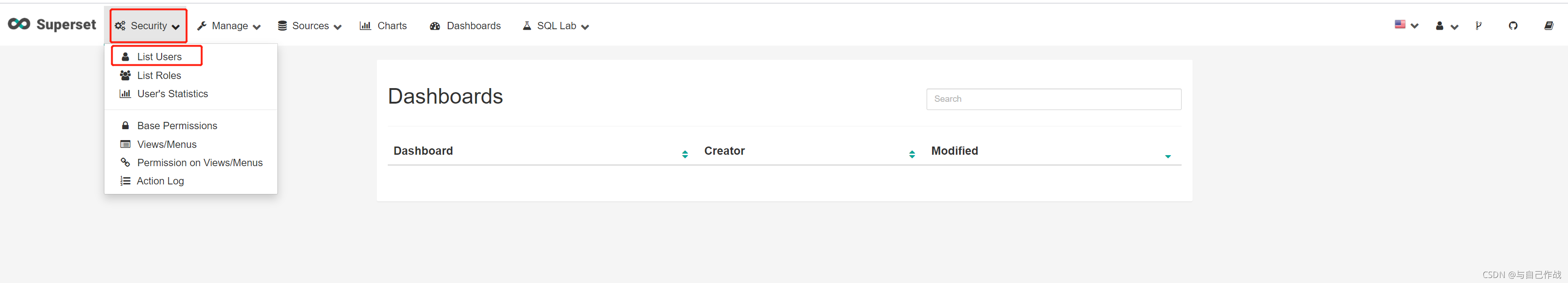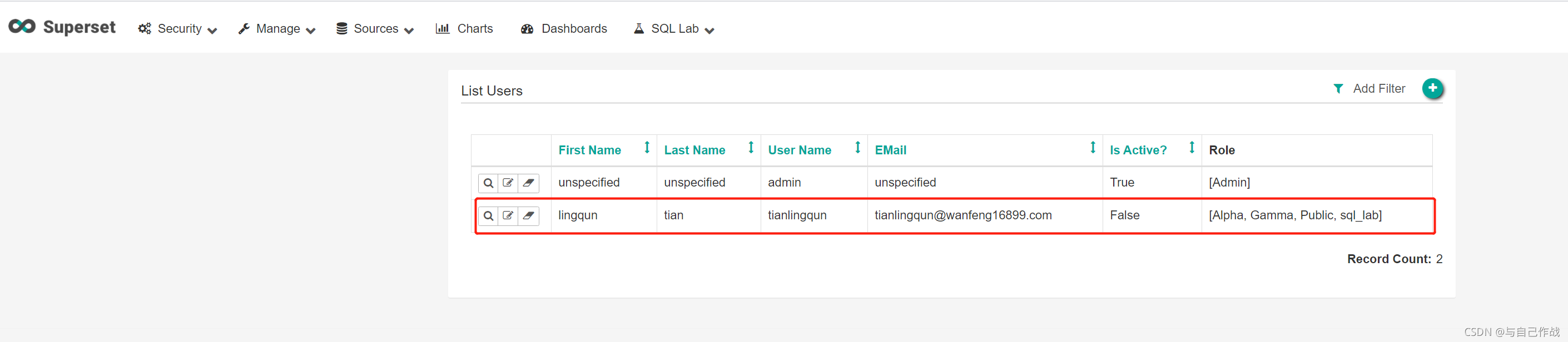4、登陆 Superset 后,在用户列表里面添加“⽩名单”