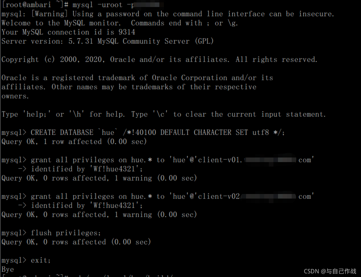 2.3.1 进ambari服务器(MySQL数据库在该服务器运行),创建 hue 数据库,并授权