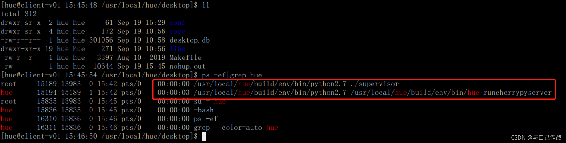 2.3.6 在 client-v01 服务器,以 hue 用户尝试启动Hue,看是否能启动。