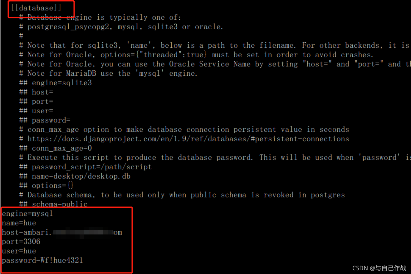 2.3.3 修改 /usr/local/hue/desktop/conf/hue.ini 配置文件,添加如下内容到 [[database]]