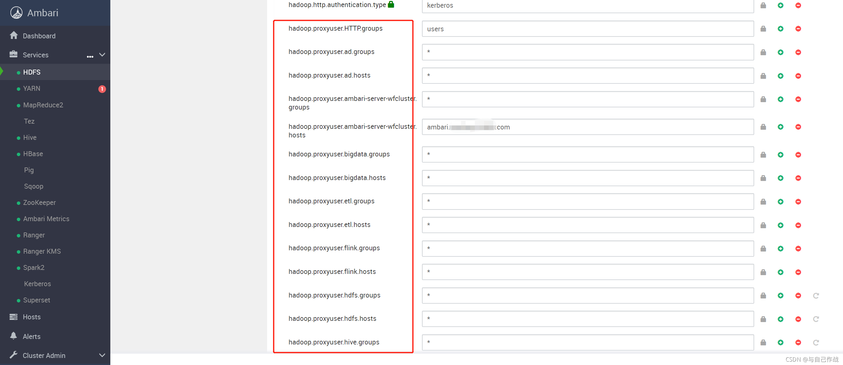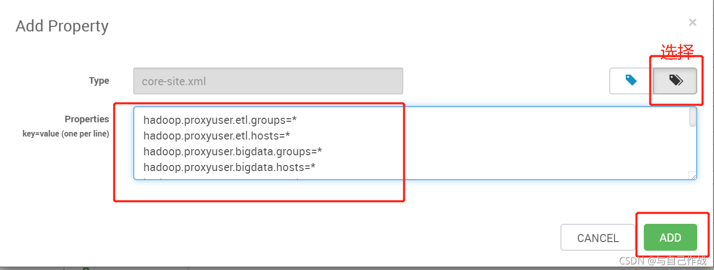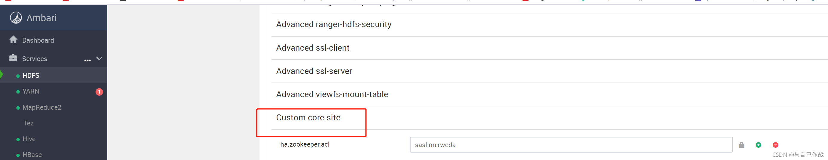 在Ambari控制台,点击 "HDFS" -> "CONFIGS" -> "ADVANCED" ->"Custom core-site" -> "Add Property" ,在弹出来的"Add Property"窗⼝选择"Bulk property add mode"图标,然后将上⾯的