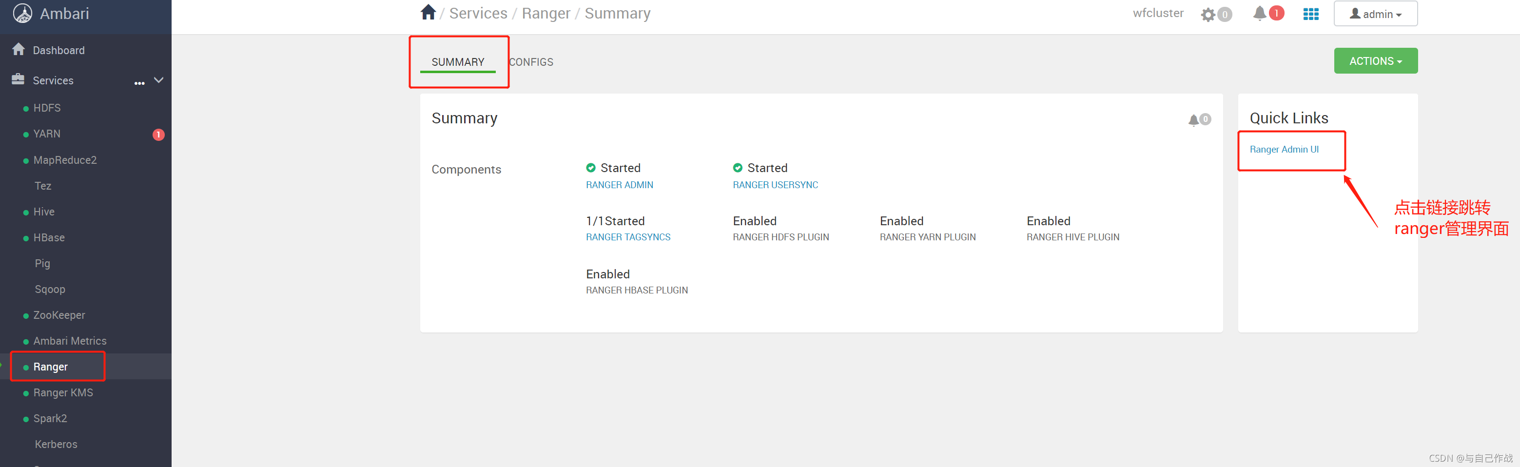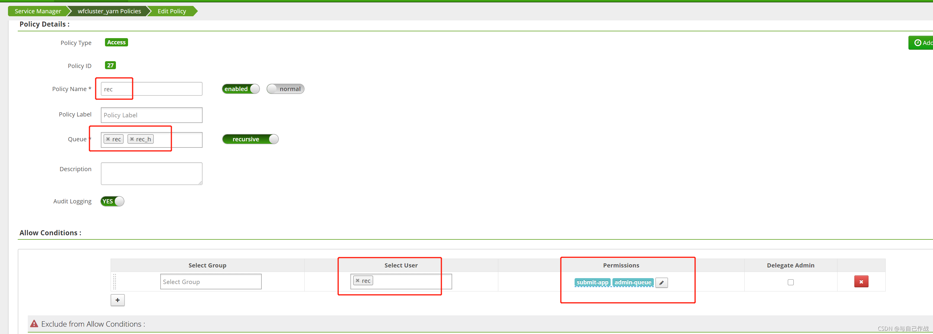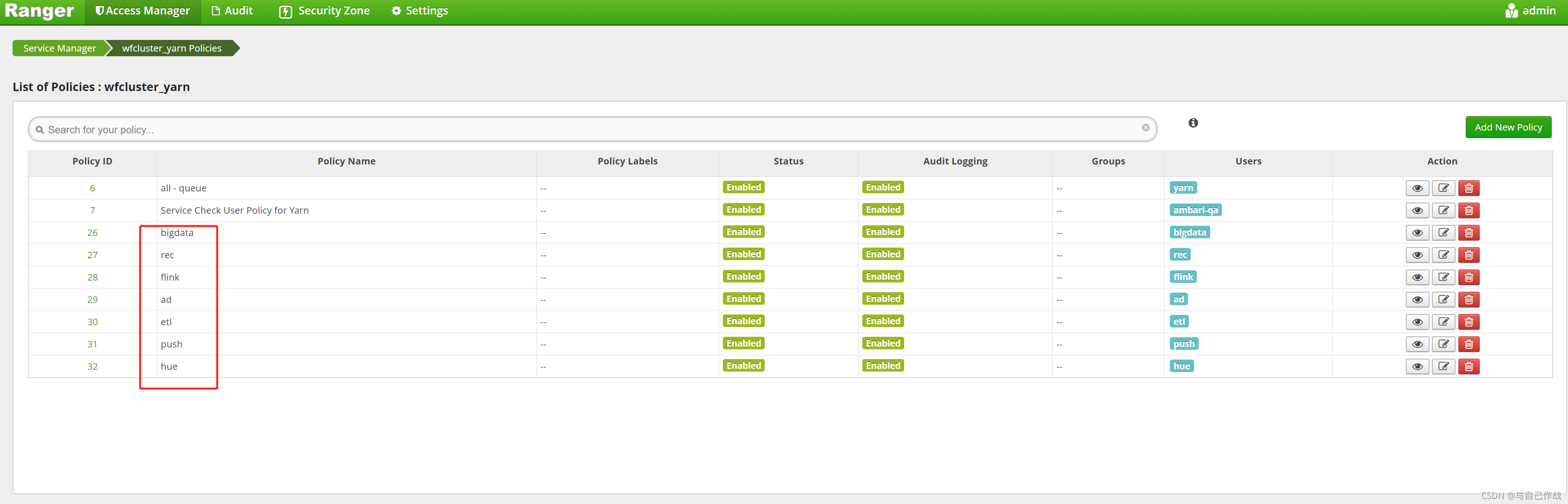 12、进 "Ranger Admin UI"给hdfs用户 相关库授权。如下图,点击" wfcluster_yarn" 进去后,点击"Add New policy"