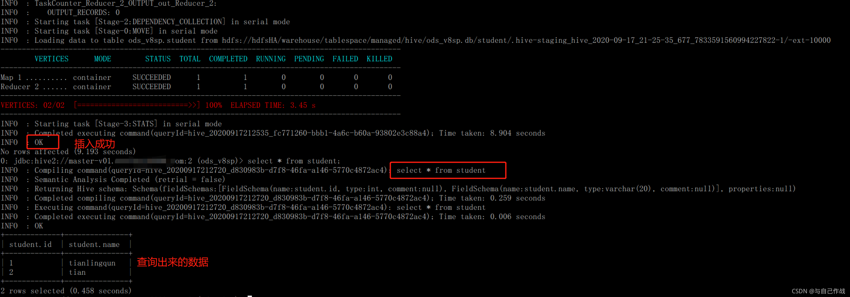 16、以 bigdata ⽤户进hive 后,尝试在 ods_v8sp 库建表,并插⼊数据成功