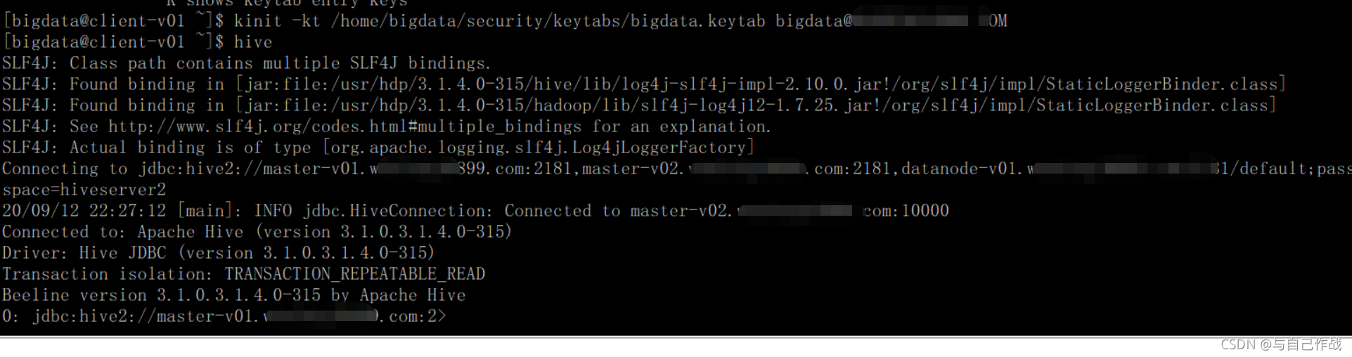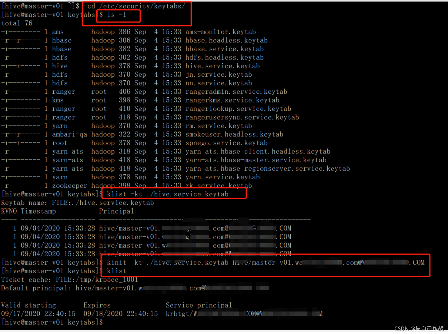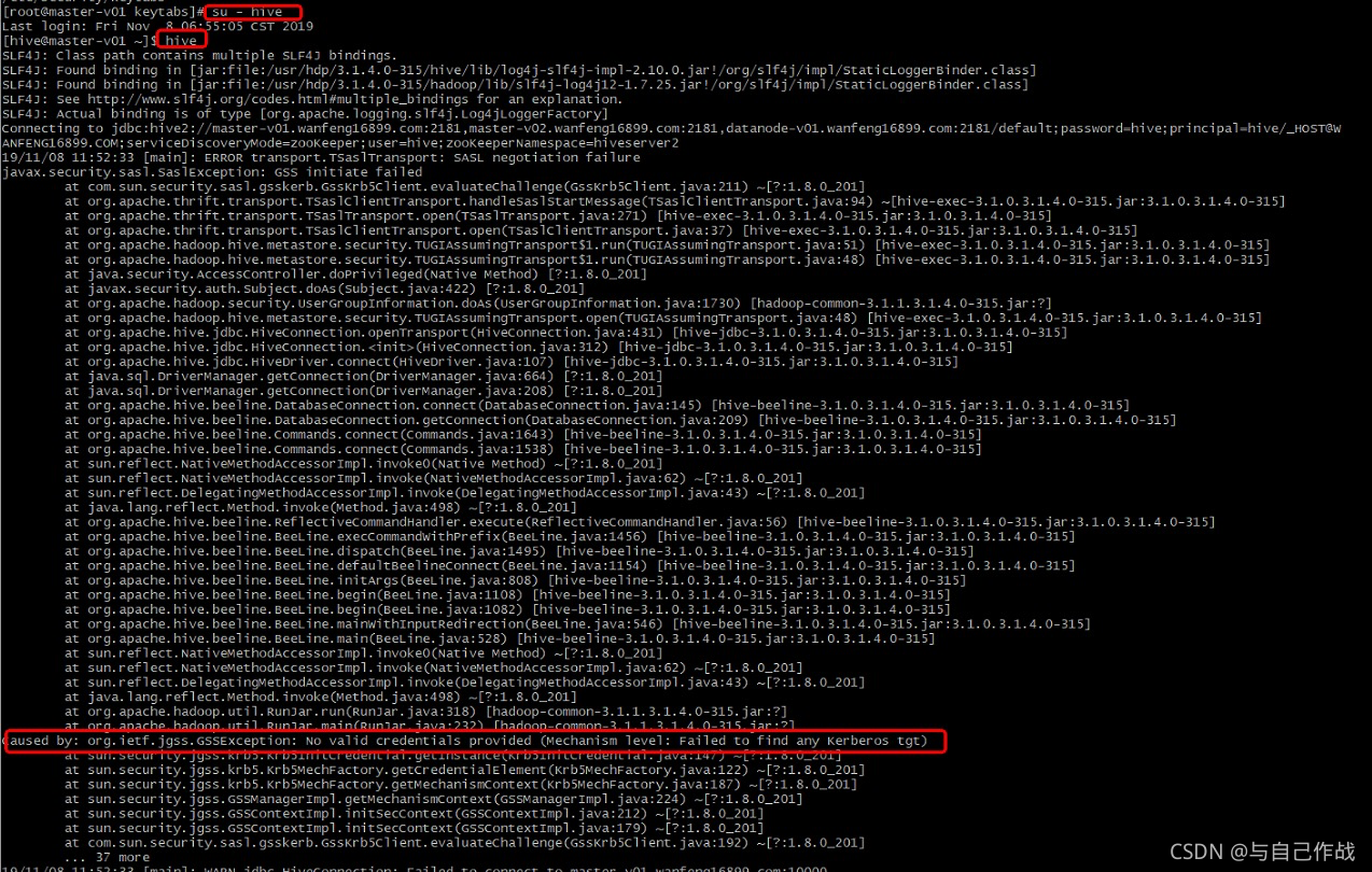直接⽤ hive 命令进去,报错"Failed to find any Kerberos tgt",原因是我们没有初始化票据。于是我们先到 /etc/security/keytabs/ ⽬录,查⼀下 hive 相关的票据⽂件,执⾏如下命令: