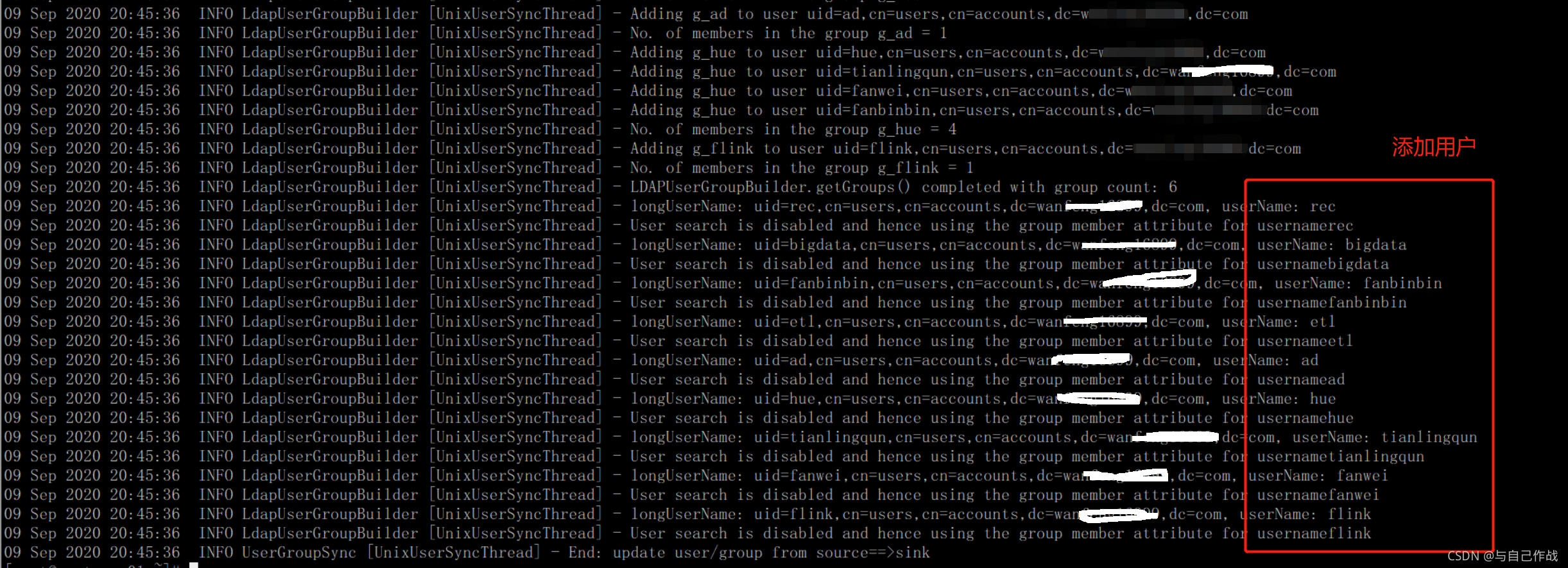 重启 Ranger 的 "RANGER USERSYNC"组件查看cat /var/log/ranger/usersync/usersync.log 日志