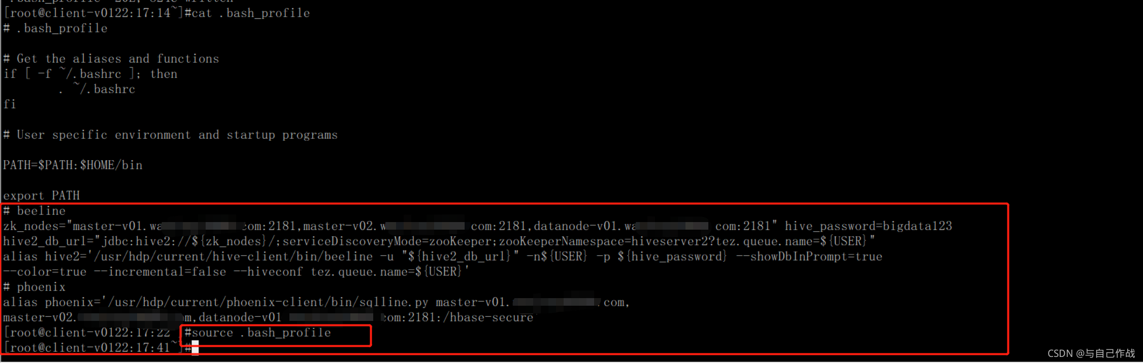 13、配置⽤户环境,⽣成⽤户票据(因为 client-v[01,02]两台服务器主要⽤来执⾏相关任务的,所以该步操作主要在这两台机器上进⾏)这⾥以 bigdata ⽤户为例,在 client-v01 服务器以root⽤户操作