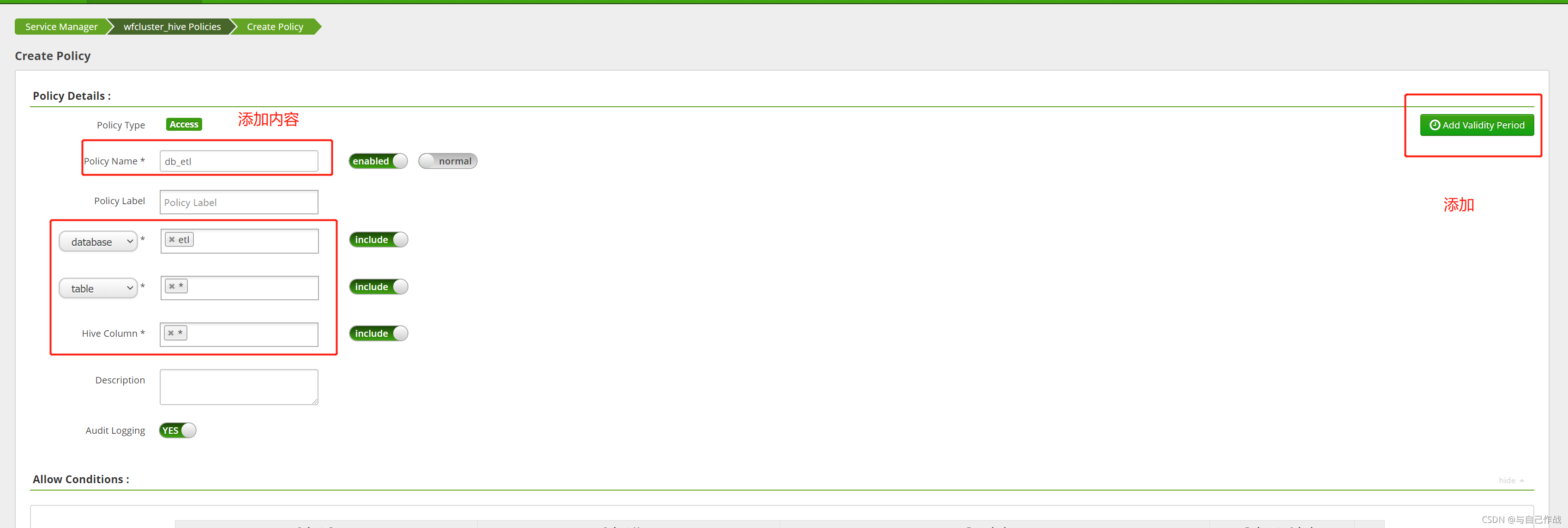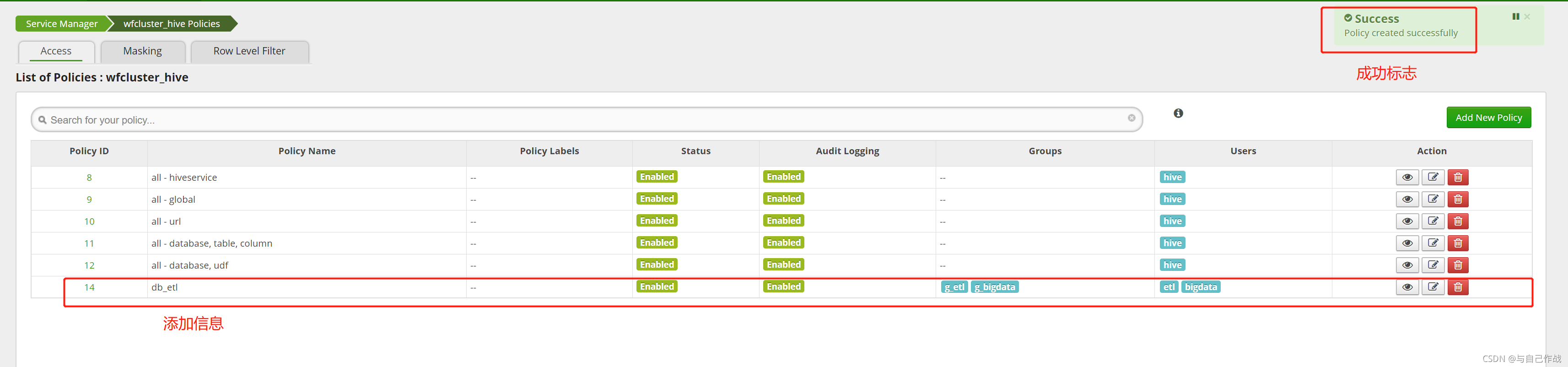 7、进 "Ranger Admin UI"给Hive 相关库授权。如下图,点击"wfcluster_hive" 进去后,点击"Add New policy",主要是以库为单位创建相关 Policy
