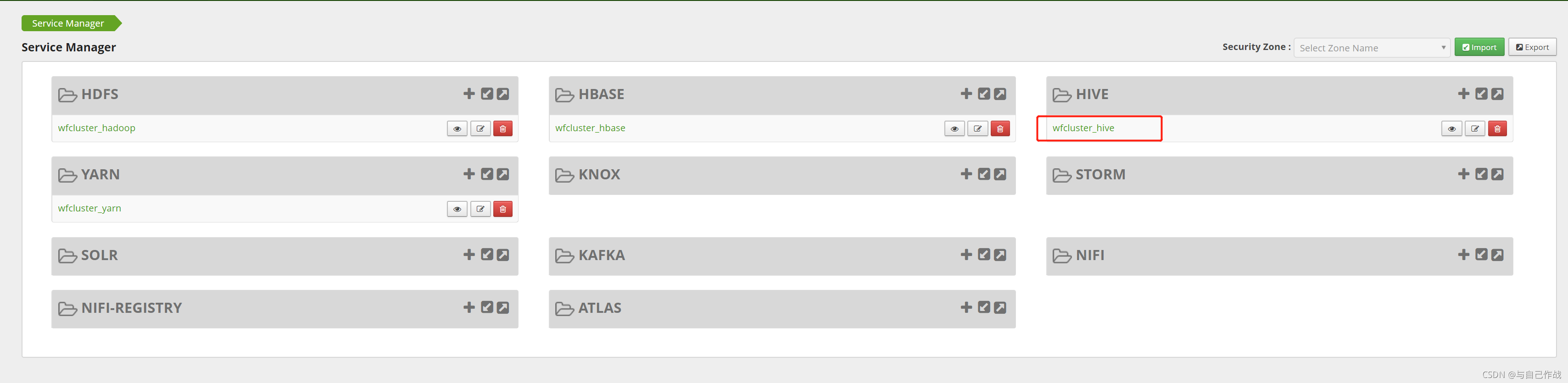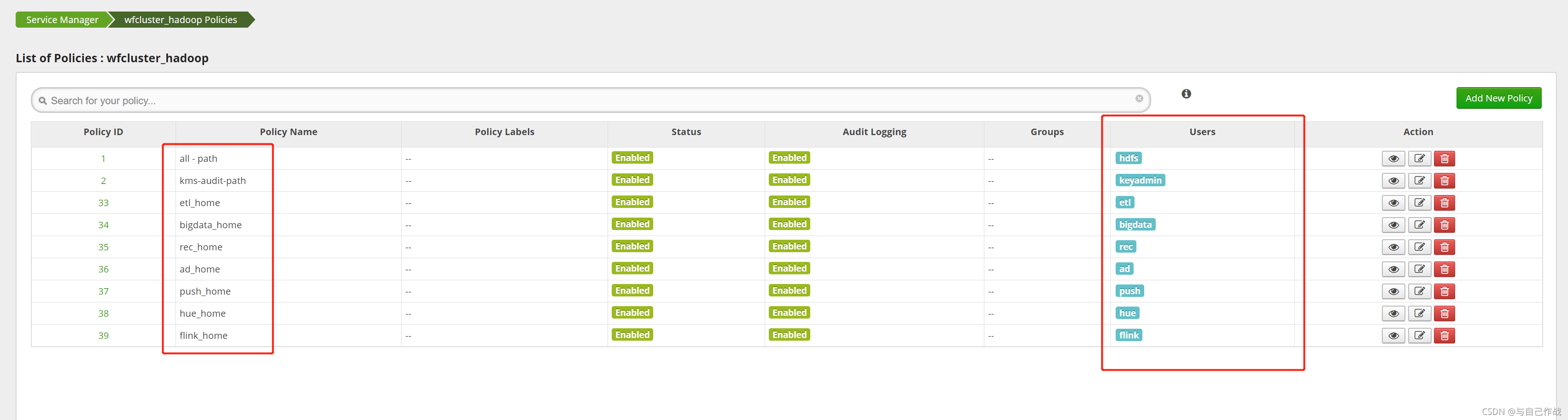 8、进 "Ranger Admin UI"给hdfs用户 相关库授权。如下图,点击"wfcluster_hadoop" 进去后,点击"Add New policy"
