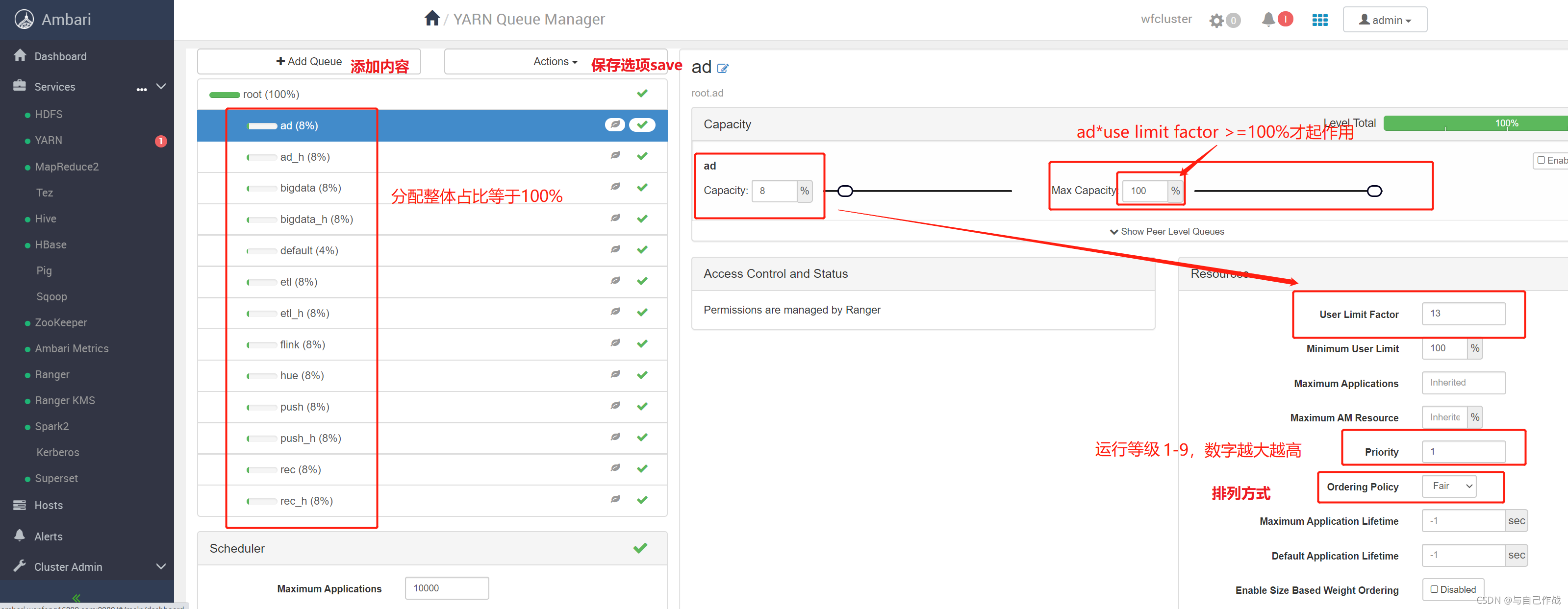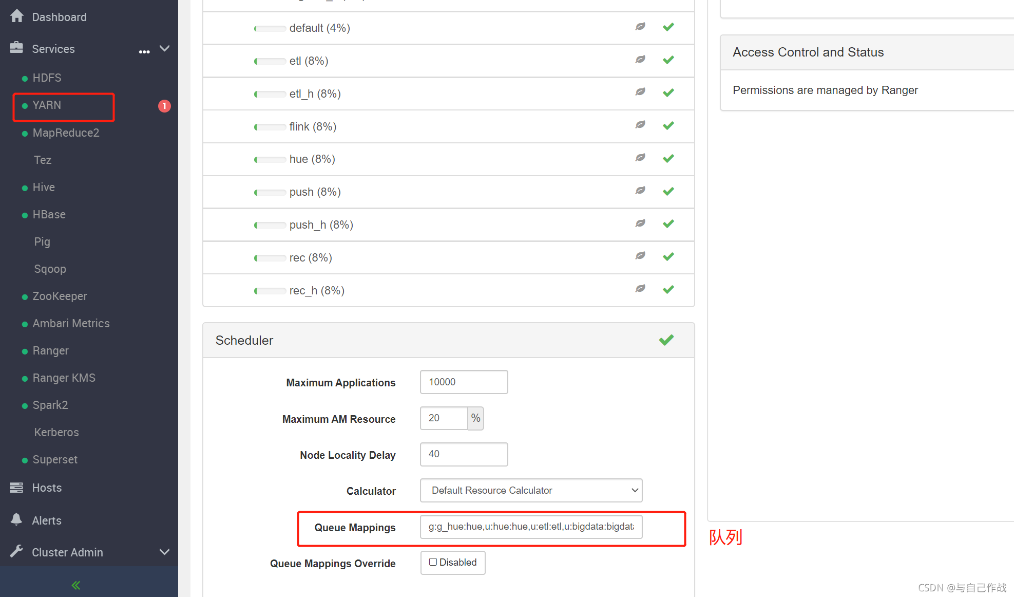 11、添加相关⽤户的 Yarn 队列,并配置⽤户默认队列,并Ranger授权相关队列给相关⽤户