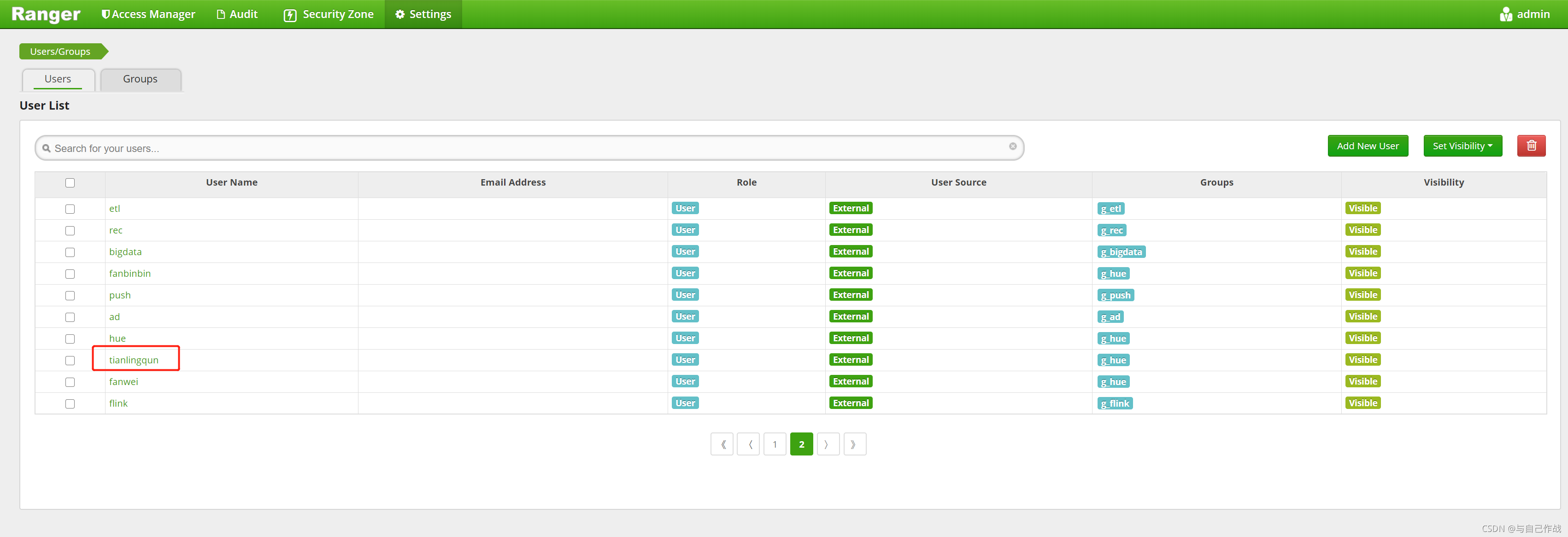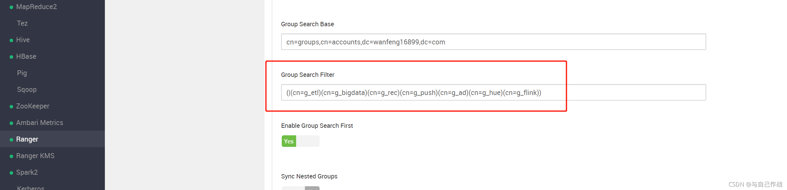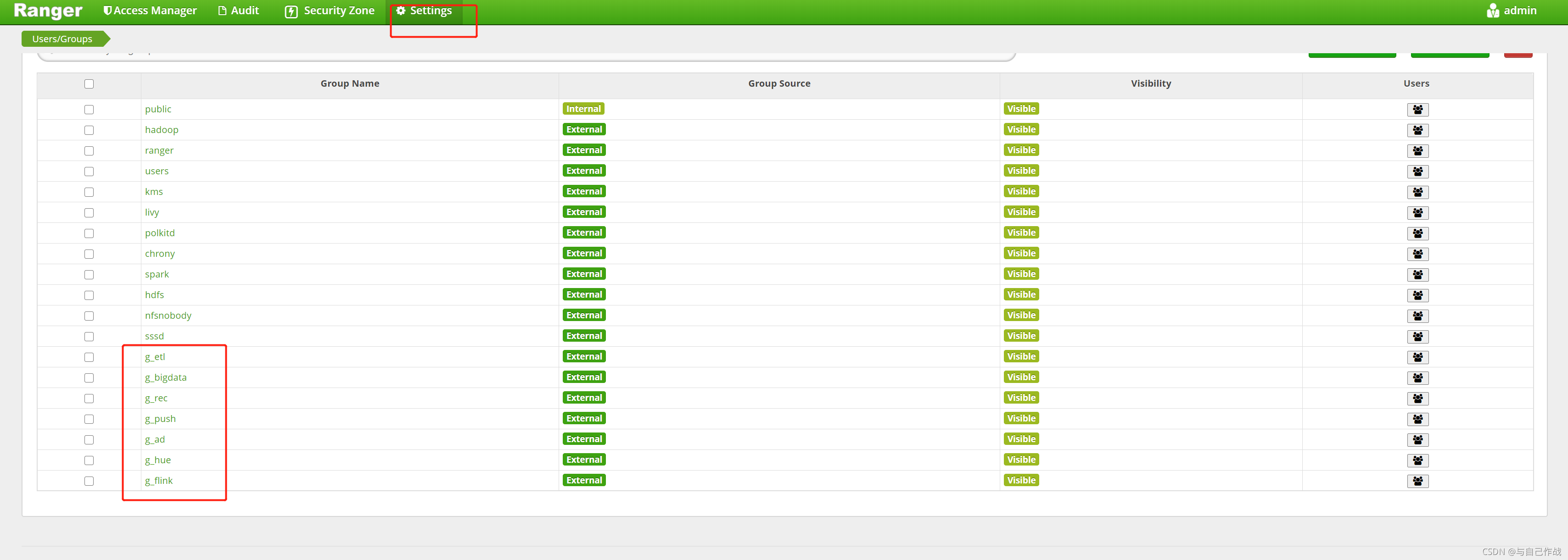 从上图我们发现 g_other 组及 other⽤户并没有同步到Ranger中(上⾯图均没找到),其主要原因是在配置 Ranger 的 "GROUPCONFIGS"的时候,参数 ranger.usersync.group.searchfilte( GroupSearch Filter ) 的值中并没有包含 g_other 组