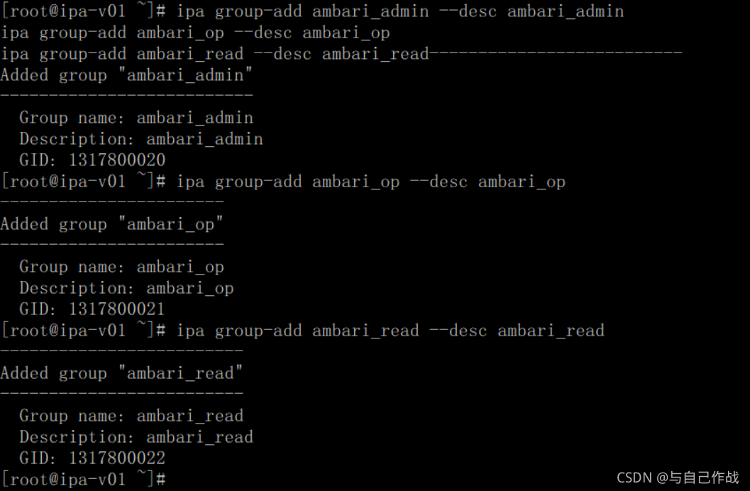 1、在 ipa-v01 服务器执行如下命令,创建三个用户组:1). ambari_admin 是管