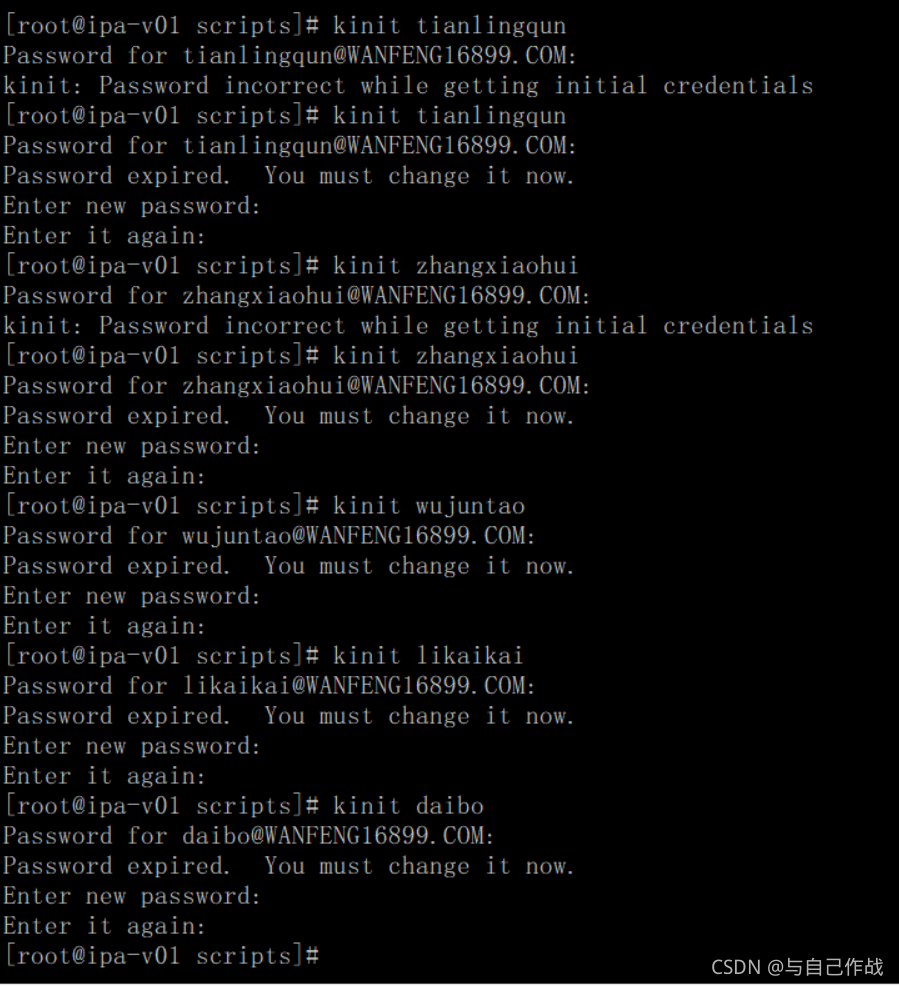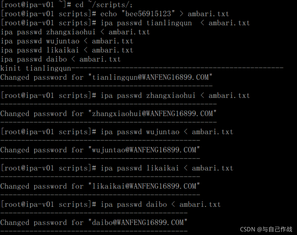 2、在ipa-v01 服务器执行如下命令,创建五个用户:tianlingqun,