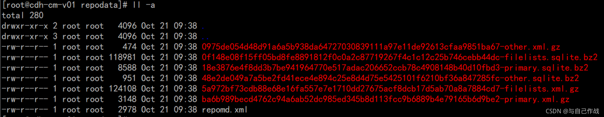 2、执行 "createrepo ."后,将在 /var/www/html/cloudera-repos/ 目录下生成 repodata 目录