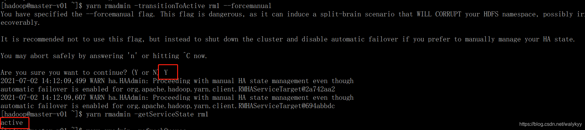 yarn rmadmin -transitionToActive rm1 --forcemanual