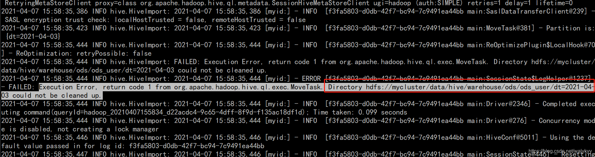 错误:Execution Error, return code 1 from org.apache.hadoop.hive.ql.exec.MoveTask. Directory hdfs://mycluster/data/hive/warehouse/ods/ods_user/dt=2021-04-03 could not be cleaned up.