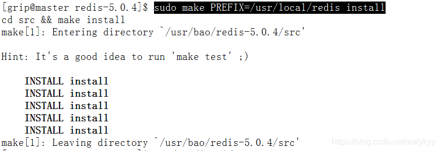 6、安装:sudo make PREFIX=/usr/local/redis install