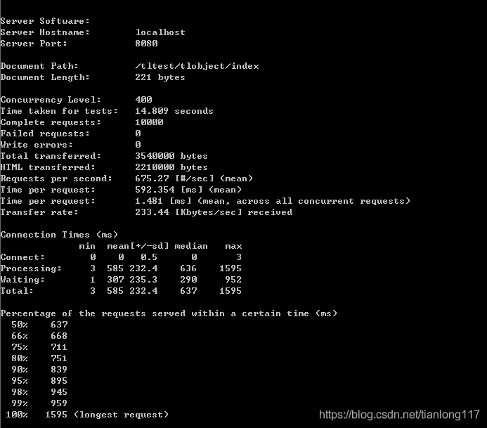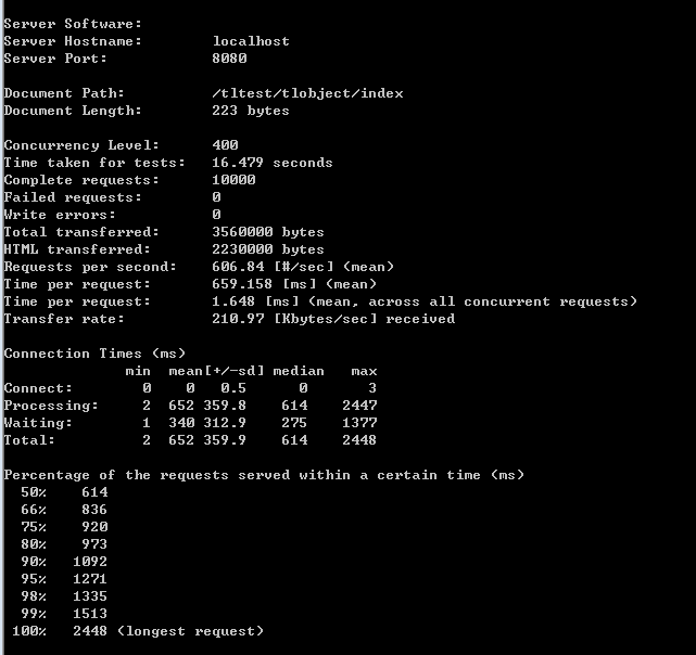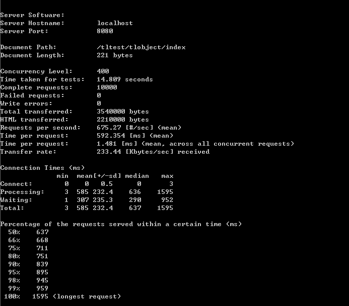 测试命令 :ab -n 10000 -c 400 http://localhost:8080/tltest/tlobject/index