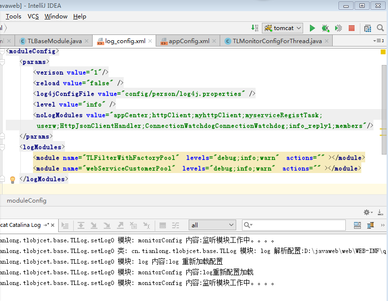 对于 log 模块 ,如其他模块调用log模块,(方法:putmsg(“log”,msg)),调用是用的模块名称“log”,现在这个log名字在工厂中对应的是TLLog类,如果想更换类则更改工厂配置。比如更改为 TLNewLog,则“log” 指向新的类,对其他模块不影响,因为其他模块使用的是其名字。那么实现热部署可由以下两步: