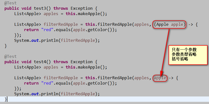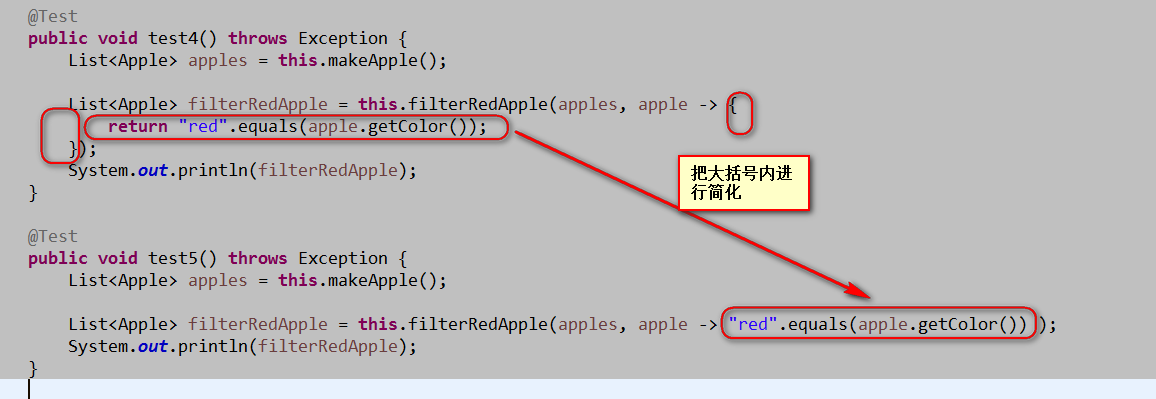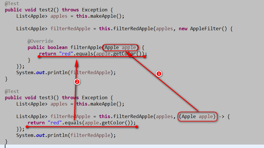 1 @Test 2 public void test3() throws Exception { 3 List<Apple> apples = this.makeApple(); 4 5 List<Apple> filterRedApple = this.filterRedApple(apples, (Apple apple) -> { 6 return "red".equals(apple.getColor()); 7 }); 8 System.out.println(filterRedApple); 9 }