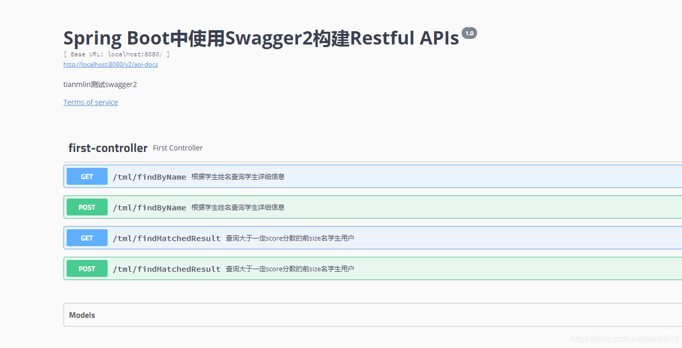 在springboot中集成swagger2后,接口文档和接口测试将变得更加的简洁,更全的代码请移步我的github:https://github.com/tianmlin19/,谢谢!