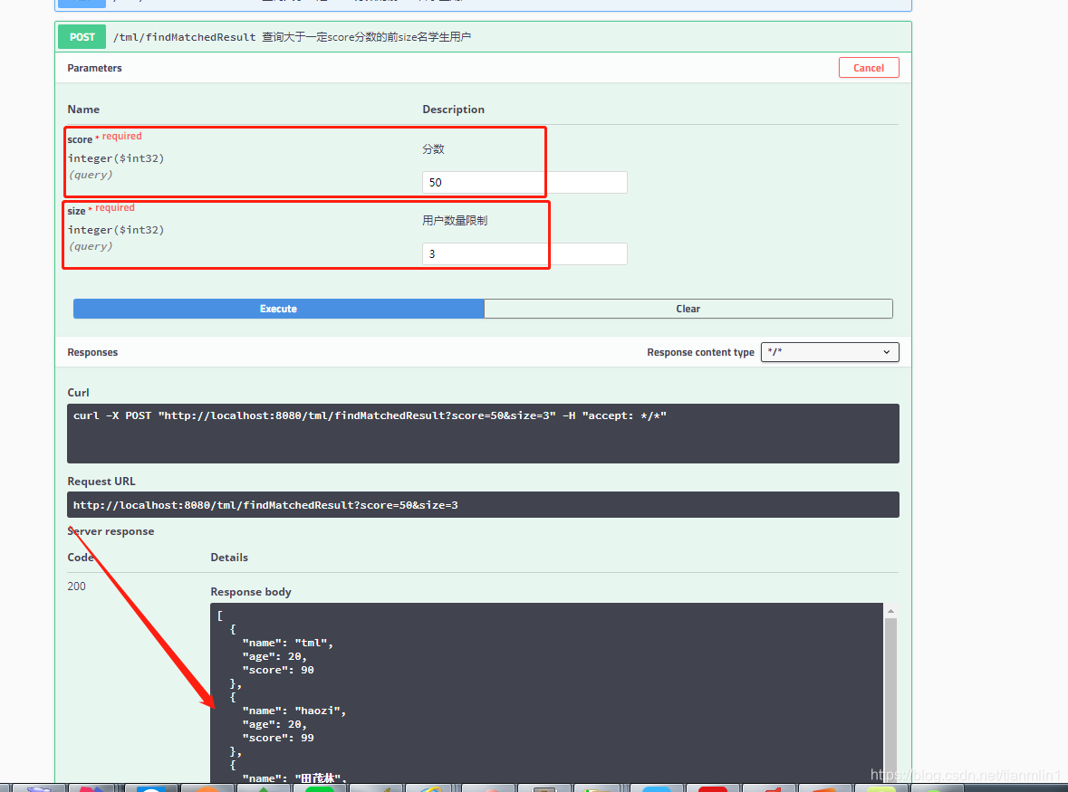 @ApiOperation(value = "查询大于一定score分数的前size名学生用户")