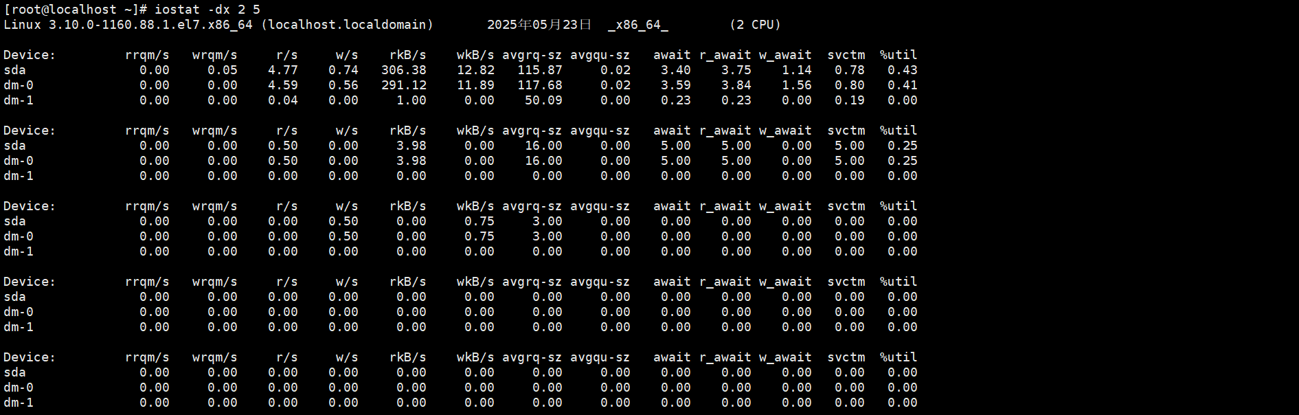 - 每隔 2 秒输出一次扩展 I/O 统计,共输出 5 次。
