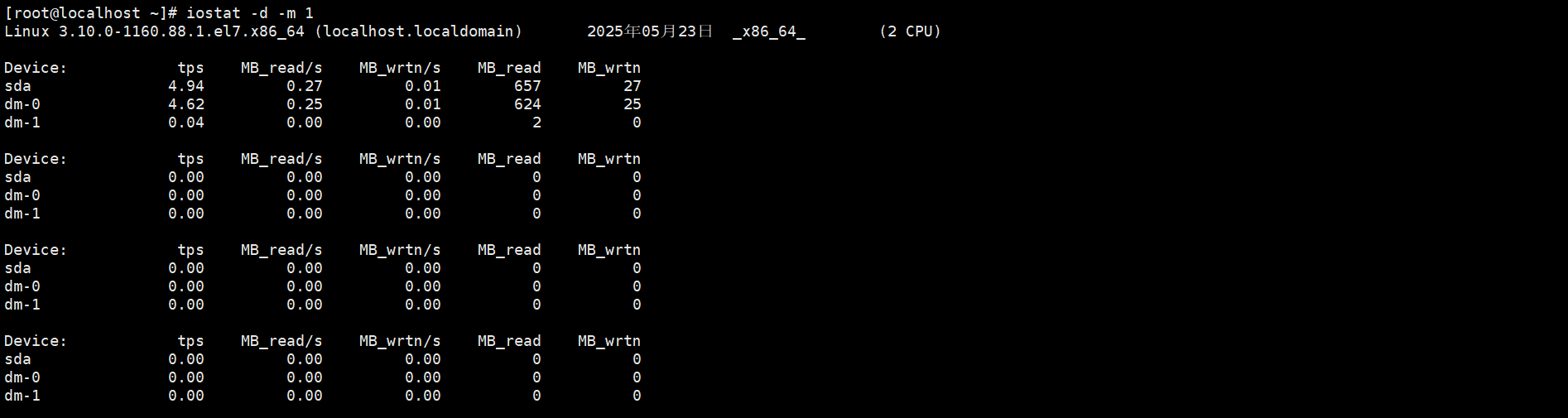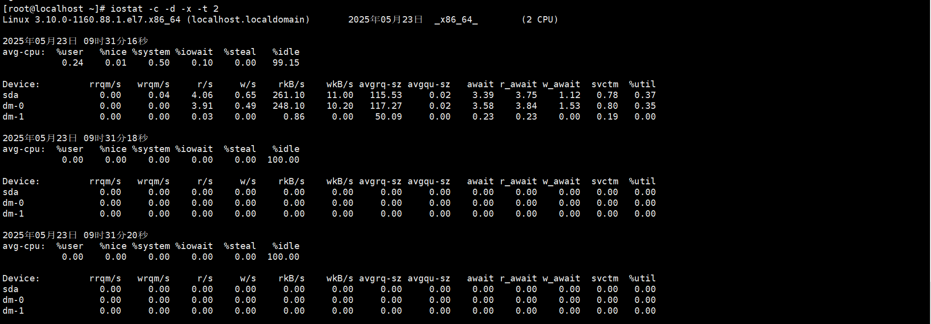 -c: 仅显示 CPU 使用率。-d: 仅显示磁盘 I/O 统计(默认显示 CPU 和磁盘)。-x: 显示扩展统计信息(更详细的 I/O 指标)。-m: 以 MB/s 为单位显示读写速度(默认单位为 KB/s)。-p[设备名]: 显示指定磁盘的详细信息。-t: 显示时间戳(便于记录监控数据的时间点)。-N: 显示 LVM 逻辑卷名称而非设备名。-h: 友好格式输出(例如,自动转换单位)。